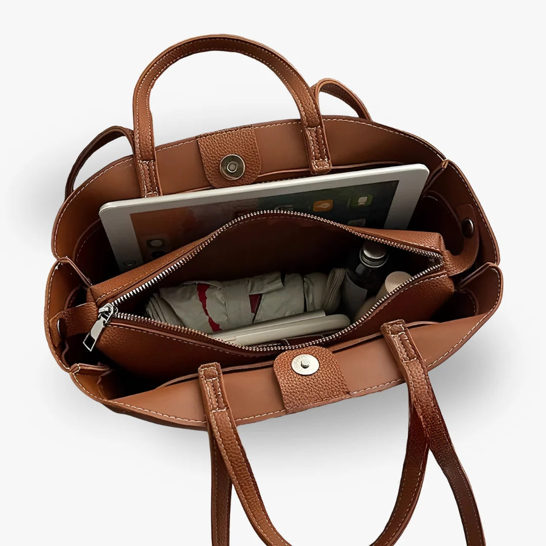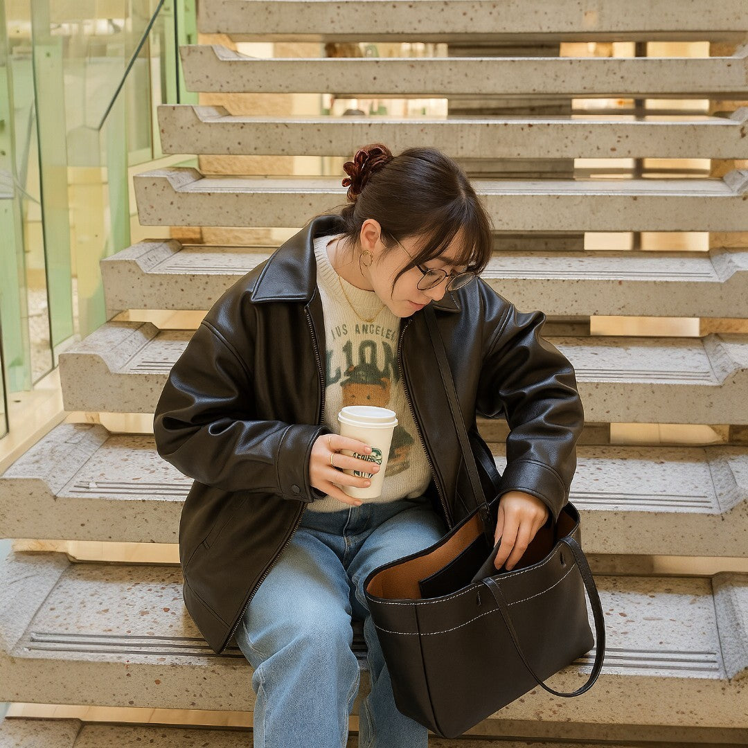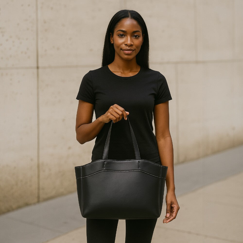 Nasza torba Emma jest wykonana z wysokiej jakości skóry roślinnej, łącząc swobodny styl z trwałością. Zaprojektowana tak, aby była wystarczająco pojemna, łatwo pomieści Twoje niezbędne rzeczy: laptop, makijaż i codzienne akcesoria.